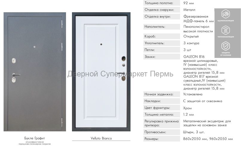 Внутренняя панель "Velluto Bianco" выполнена в нежном белом оттенке с текстурой мягкого велюра, что придает двери элегантный вид и сочетается с интерьерами в стиле минимализм, скандинавский или классика. Дверь обеспечивает повышенный уровень защиты и подходит для установки в квартиры, частные дома или офисы.