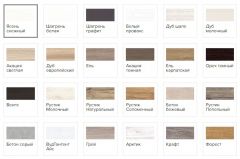 Доступные покрытия без удорожания: ▪Дуб Молочный ▪Ясень Белый ▪Белый Прованс ▪Акация Светлая ▪Дуб Европейский ▪Ель Карпатская ▪Ель ▪Бетон Серый ▪Бетон Бежевый ▪Дуб Шале	▪Шагрень Белая ▪Шагрень графит ▪Орех Темный ▪Арктик ▪Крафт ▪Акация Тёмная ▪Венге ▪Грей