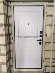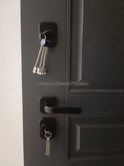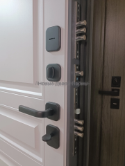 Фурнитура данной модели также поражает своей надежностью – три петли на опорном подшипнике обеспечивают плавное открытие и закрытие двери. Основной цилиндровый замок ЗВ 816 с цилиндром под шток 70/30 в сочетании с врезной броненакладкой делает выбор этой двери вашим верным решением для защиты жилья. Дополнительный сувальдный замок ЗВ 817 с накладками со шторками добавляет дополнительный уровень безопасности.