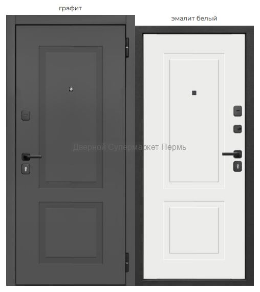 Внешнее покрытие: фрезерованная МДФ-панель 8 мм, цвет - «графит» Внутреннее покрытие: фрезерованная МДФ-панель 6 мм, цвет - «эмалит белый» Толщина дверного полотна: 75 мм Глубина дверного короба: 90 мм Наполнитель: пенополистирол Уплотнитель: 2 контура уплотнителя из вспененной резины Ручка: раздельная; цвет - черный Глазок: широкого обзора; цвет - черный Петли: 2 шт., наружные, открывание 180° Основной замок: цилиндровый RIGGER/MONARCH, IV (наивысший) класс взломостойкости; диаметр ригелей: 16 мм Дополнительный замок: сувальдный RIGGER/MONARCH, IV (наивысший) класс взломостойкости, дополнительная защита от высверливания: две пластины из высоколегированной стали с обеих сторон замка; диаметр ригелей: 16 мм Накладки: накладные декоративные; цвет - черный Независимая ночная задвижка Регулировка прижима притвора: металлический эксцентрик для защёлки на основном замке Противосъём: штыри, 2 шт. Размеры: 860х2050 мм, 960х2050 мм