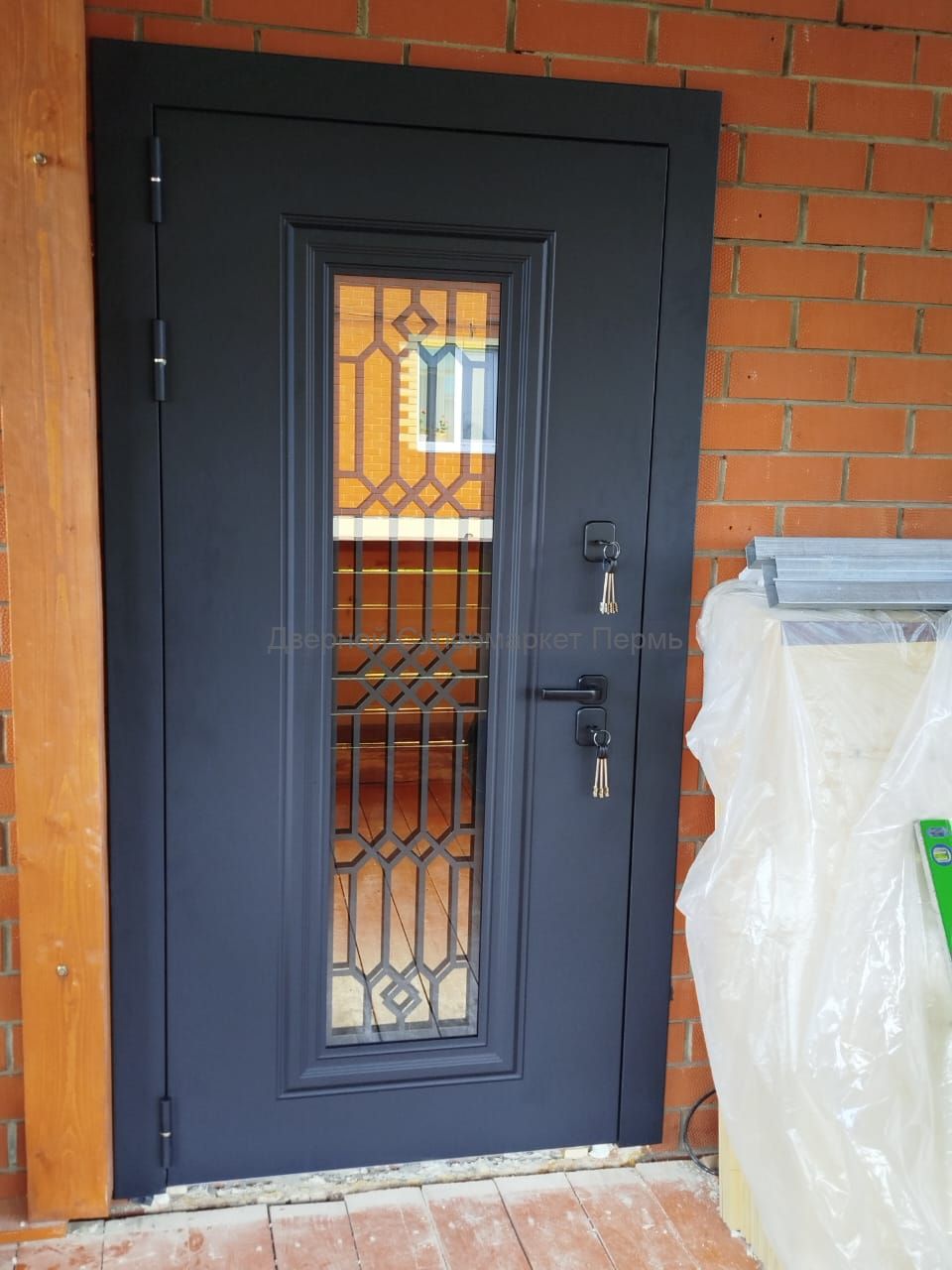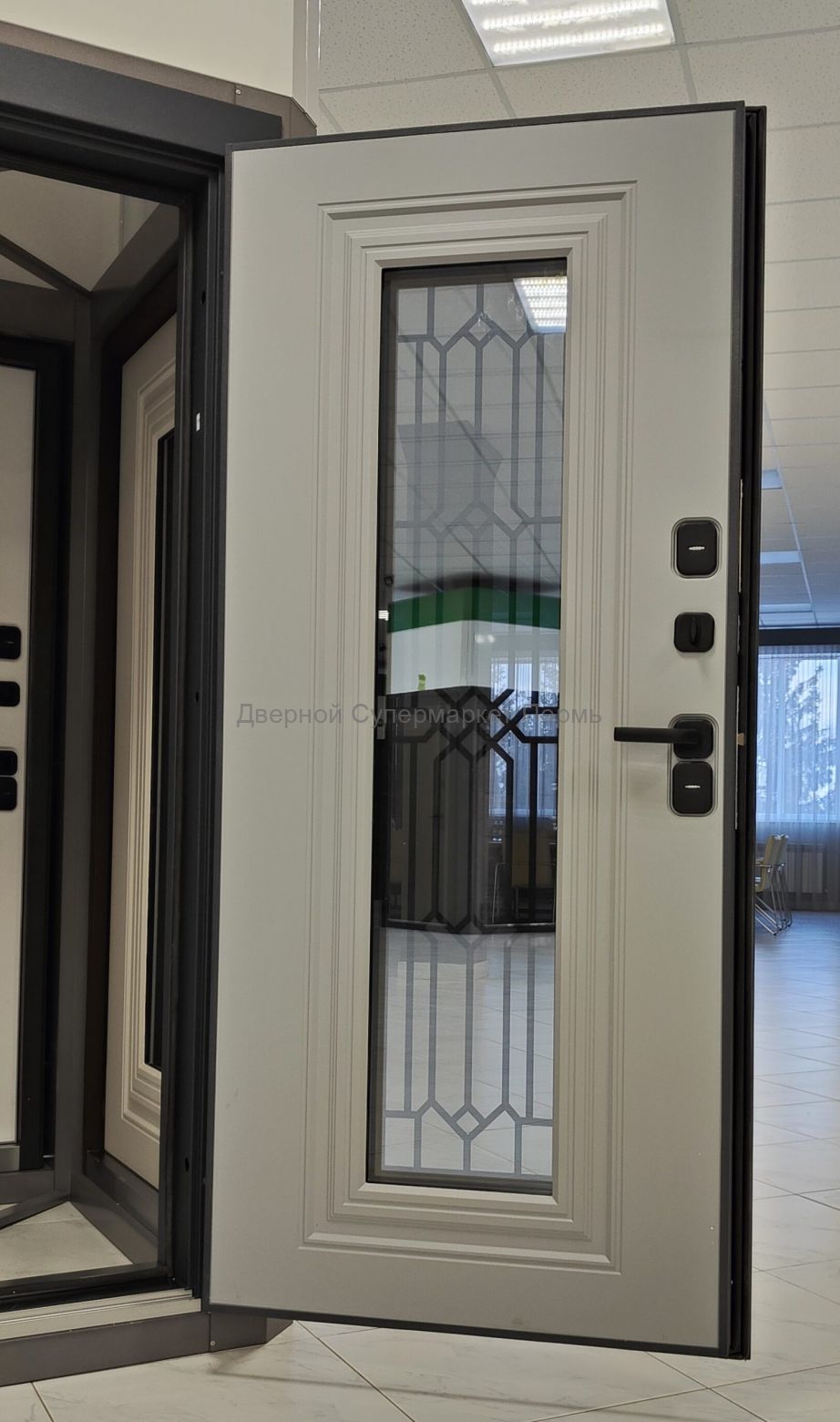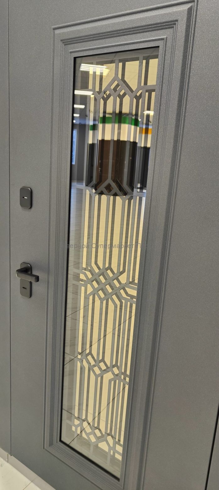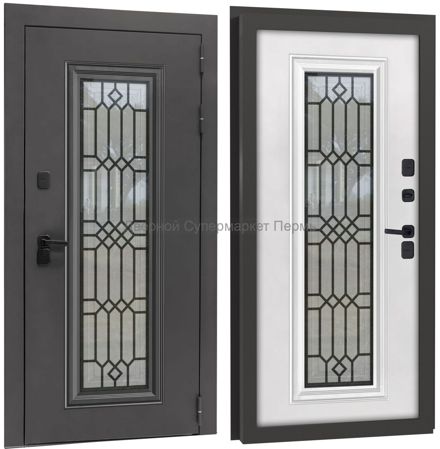 Внешняя отделка: черный муар. Внутреняя отделка: МДФ 10 мм, Веллюто ванилла. Заполнение полотна: Базальтовая плита и ППС. Толщина дверного полотна 105мм, стеклопакет-графит 2 крайних стекла, 3 петли, 3 контура уплотнителя. Замковая система: Основной - сувальдный Замок Гардиан 30.11. Дополнительный замок врезной сувальный Гардиан 30.01. Ночная независимая задвижка. Ручка – Раздельная (черный) Порог из нержавеющей стали