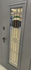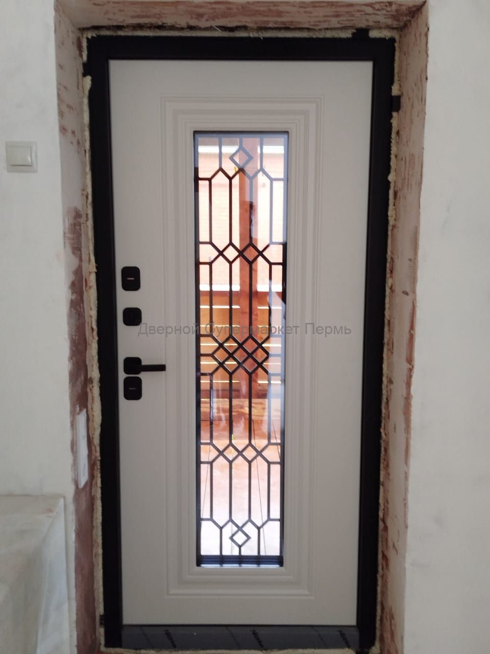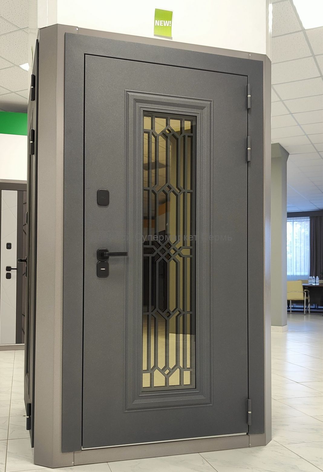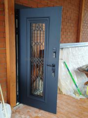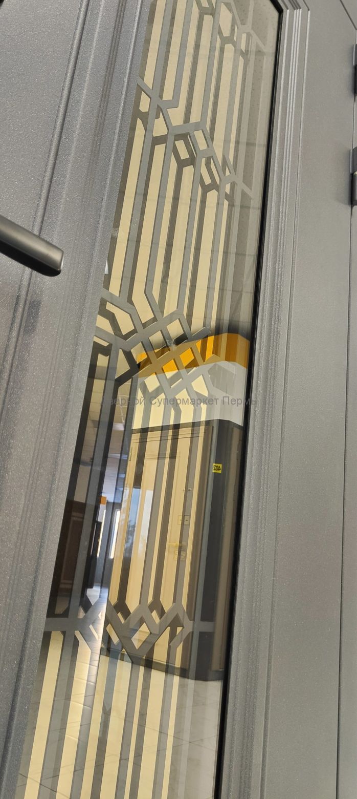 Внешняя отделка: черный муар. Внутреняя отделка: МДФ 10 мм, Веллюто ванилла. Заполнение полотна: Базальтовая плита и ППС. Толщина дверного полотна 105мм, стеклопакет-графит 2 крайних стекла, 3 петли, 3 контура уплотнителя. Замковая система: Основной - сувальдный Замок Гардиан 30.11. Дополнительный замок врезной сувальный Гардиан 30.01. Ночная независимая задвижка. Ручка – Раздельная (черный) Порог из нержавеющей стали
