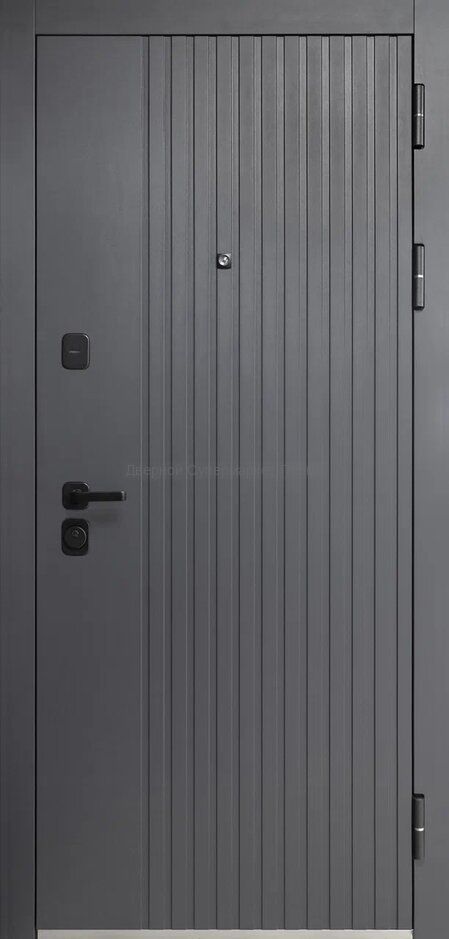 | Внешнее покрытие: фрезерованная МДФ-панель 12 мм, цвет пленки грей дарк. Внутреннее покрытие: МДФ-панель, цвет пленки мраморный светлый. Толщина дверного полотна 105 мм. Наполнитель: мин. плита плюс ППС, 3 контура уплотнения, 3 петли внешние открывание 180*. Основной замок: Гардиан цилиндровый, 4 класс взломостойкости. Порог из нержавеющей стали. Независимая ночная задвижка. |