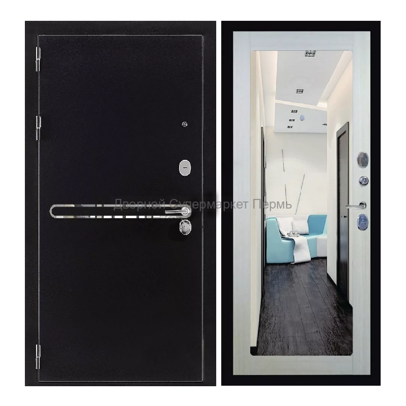 Входная дверь ДС 85 Зеркало на три петли и с большим зеркальным полотном со стороны квартиры. Дверь с 3-мя контурами уплотнения. Внутреннее наполнение полотна с применением минеральной плиты и ППС. Замочные карманы от Фуаро с механизмами 4 и 2 класса взломостойкости.
