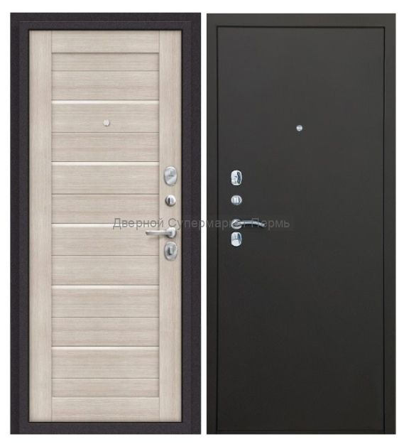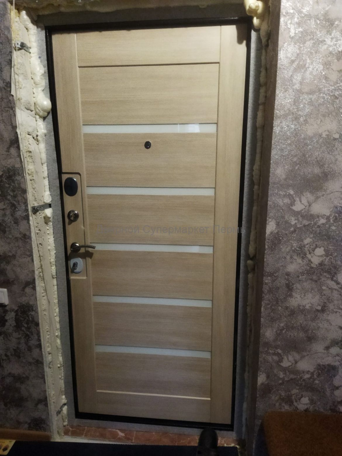 Входная металлическая дверь из серии Аляска царга с наружным покрытием порошково-полимерное медь и внутренней отделкой из МДФ со стеклянными матовыми вставками. У двери три контура уплотнения, два разносистемных замка, толщина полотна 85 мм, толщина металла 1,5 мм.
