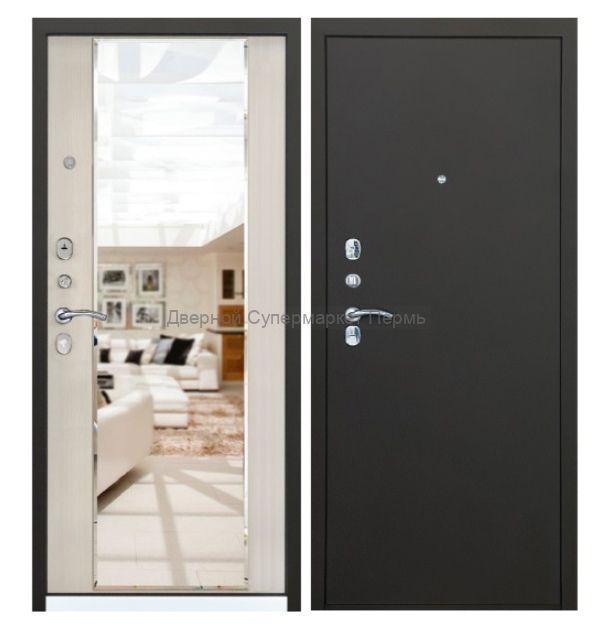 Входная металлическая дверь из серии Аляска 3 зеркало с наружным покрытием порошково-полимерное медь и внутренней отделкой из МДФ с большим зеркальным полотном. У двери три контура уплотнения, два разносистемных замка, толщина полотна 85 мм, толщина металла 1,5 мм.