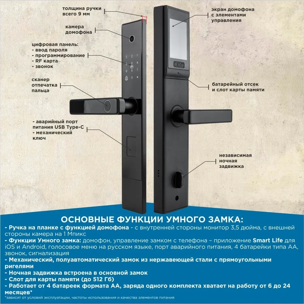 - Функции Умного замка: домофон, управление замком с телефона – приложение Smart Life для iOS и Android, голосовое меню на русском языке, порт аварийного питания, 4 батарейки типа АА, звонок, сигнализация
