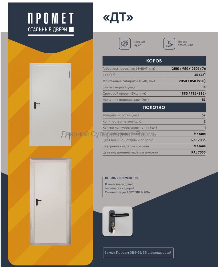 Дверь комплектуется цилиндровым замком Просам 3В4-31/55 с цилиндром 70мм.