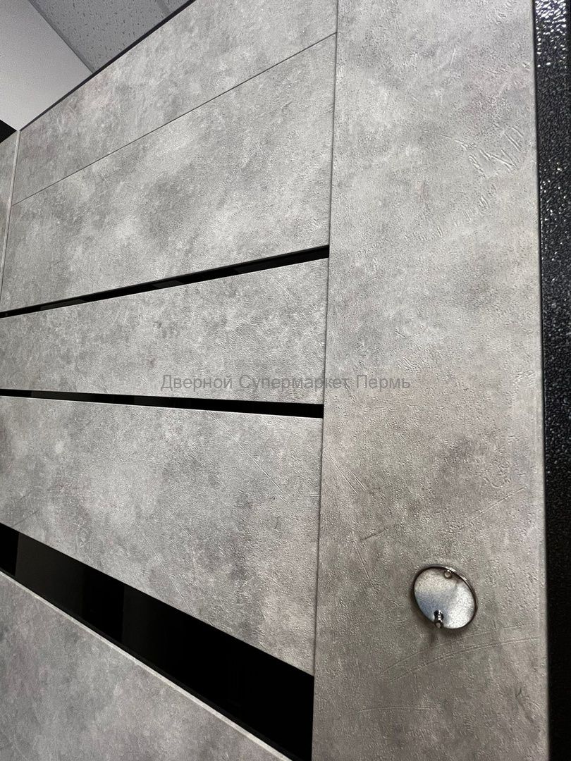 Стальная дверь СТРАЖ Модерн-2 в цвете внешней панели Антик серебро и царговой панели со вставками из черного стекла лакобель и цвета панели Бетон лофт с 2-мя контурами уплотнения для необходимой защиты Вашей квартиры от посторонних шумов и запахов, внутреннее наполнение с минеральной плитой высокой плотности надежно уберегут Вас от проникновения холода. Замочные карманы с механизмами 2 - го класса взломостойкости
