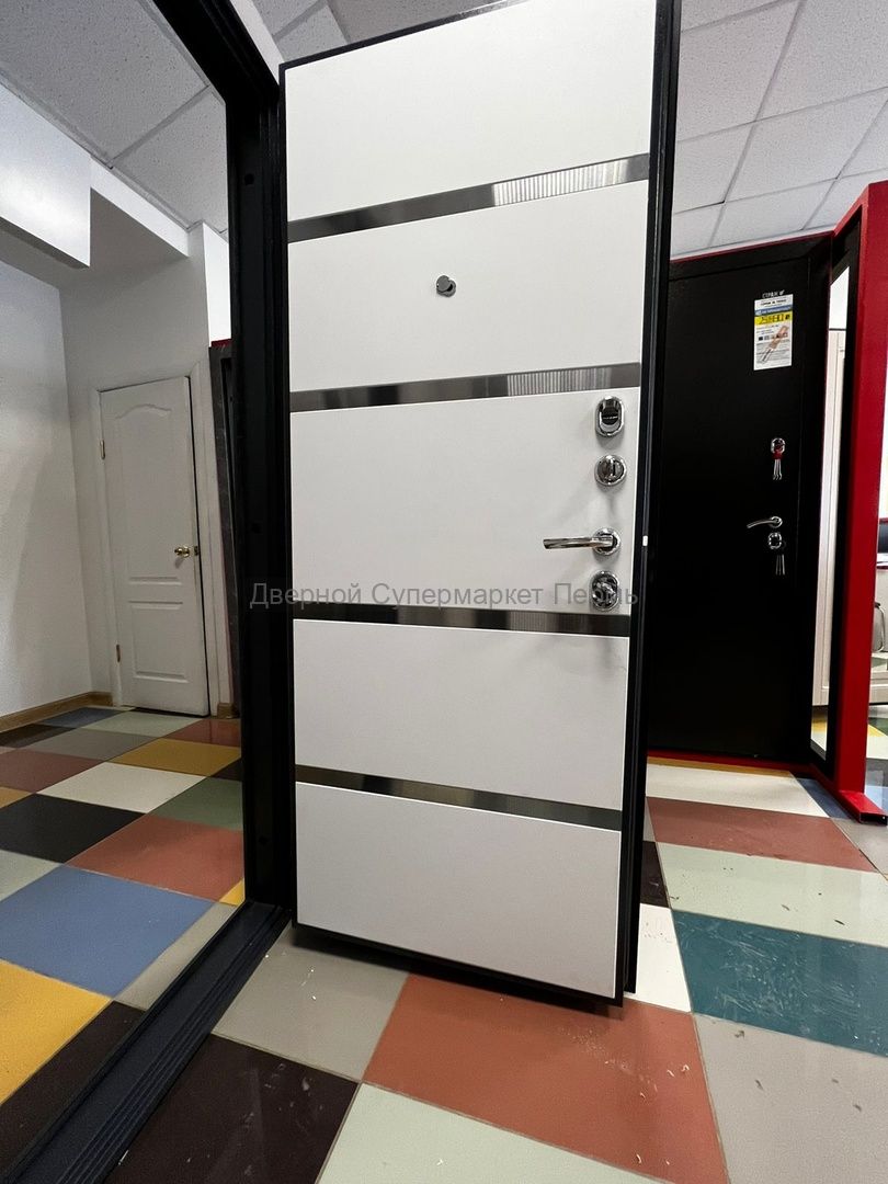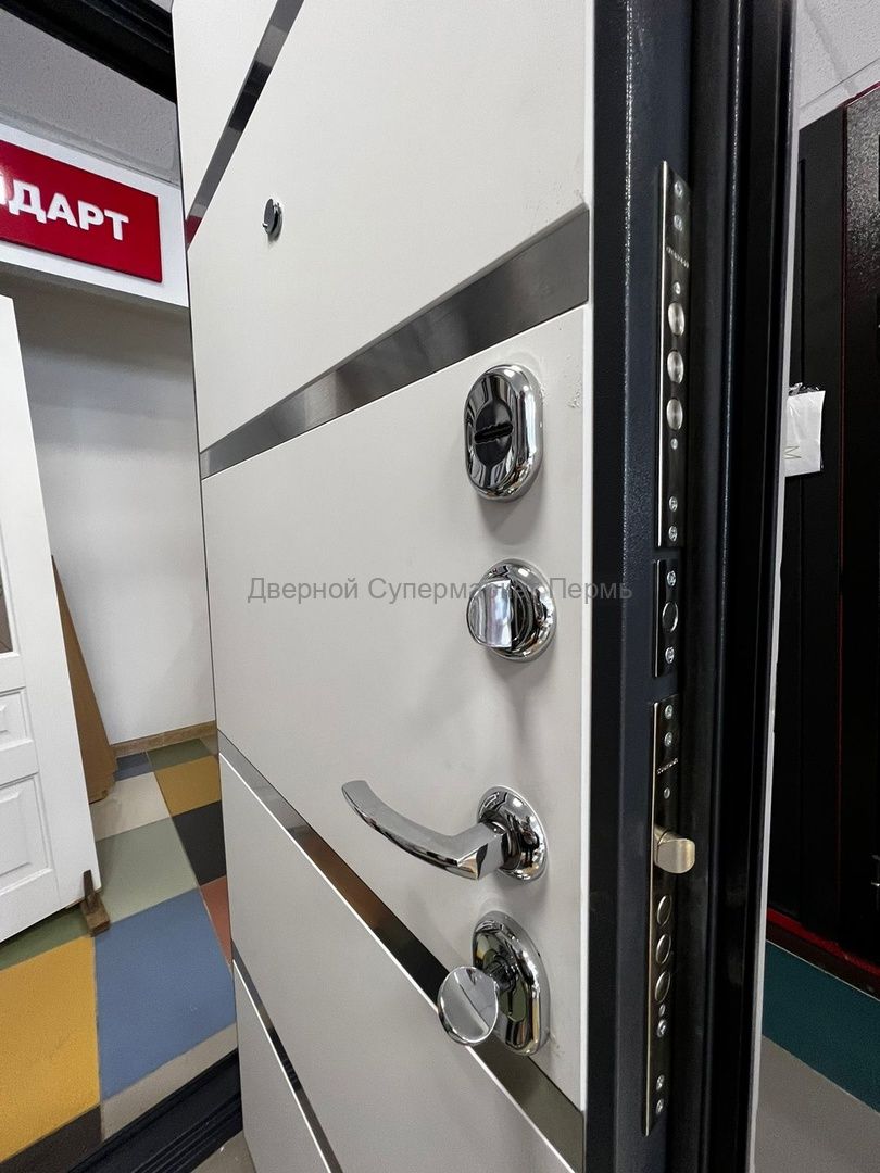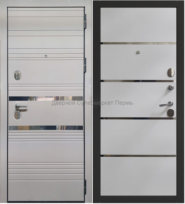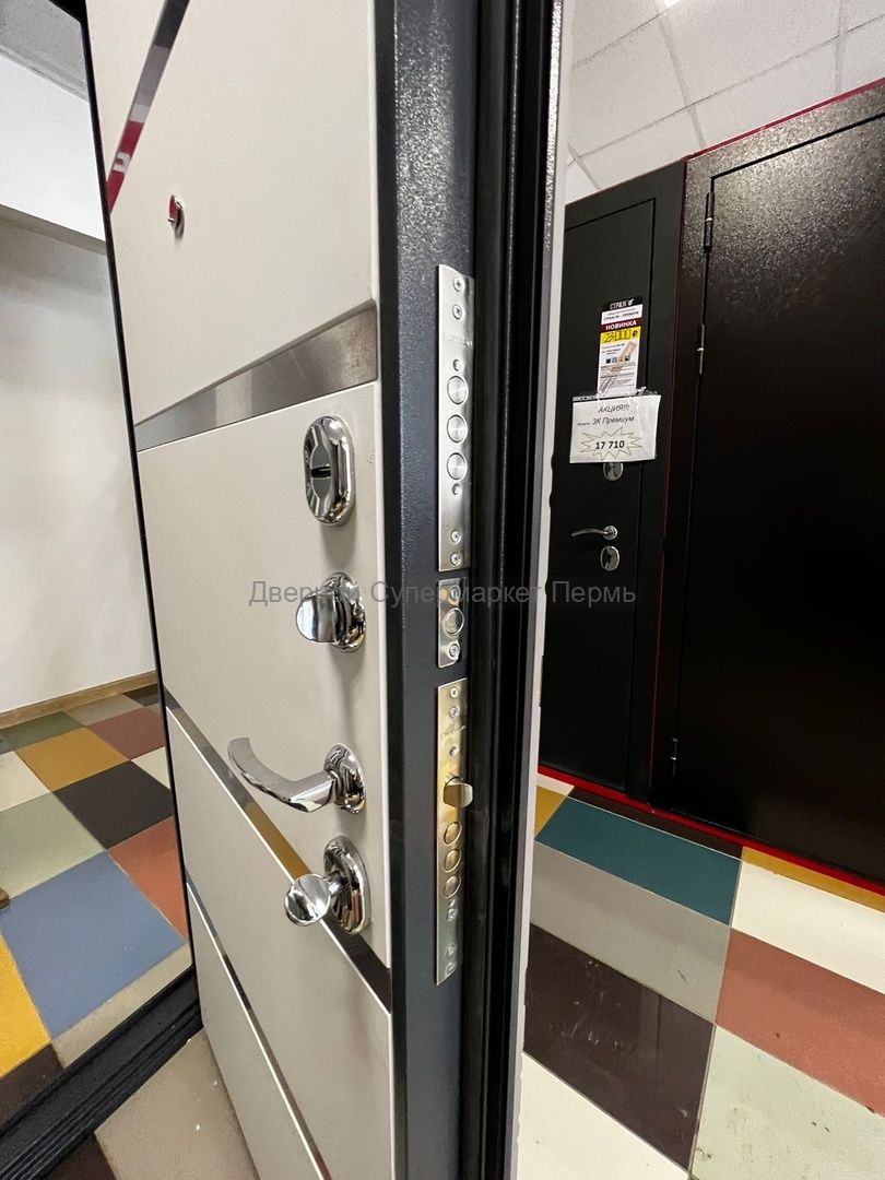 Стальная дверь СТРАЖ 3K Х42 в цвете внешней панели Софт платина и внутренней панели цвета Софт милк с 3-мя контурами уплотнения для необходимой защиты Вашей квартиры от посторонних шумов и запахов, внутреннее наполнение с применением минеральной плиты Knauf надежно уберегут Вас от проникновения холода. Замочные карманы с механизмами 4 и 2 класса взломостойкости