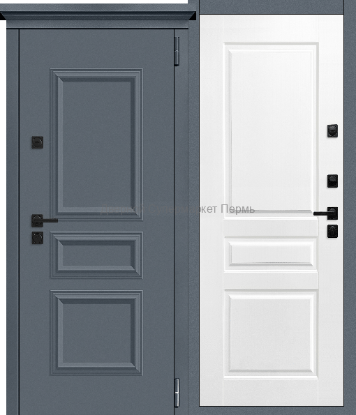 Внешнее покрытие: атмосферостойкое порошково-полимерное «Муар 7024 без блесток» Внутреннее покрытие: фрезерованная МДФ-панель 12 мм, цвет пленки «Сатин графит» Толщина дверного полотна/короба: 110 мм / 137 мм Терморазрыв 24 мм: двухкамерный спейсер из ПВХ на коробе и полотне двери Порог крашенный Наполнитель: пенополистирол Уплотнитель: 3 контура уплотнителя из вспененной резины (2 на полотне, 1 на коробе) Замки: сувальдные Mangust (наивысший) класс взломостойкости, дополнительная защита от высверливания: две пластины из высоколегированной стали с обеих сторон замка; диаметр ригелей: 16 мм. Накладки: декоративные с авто шторкой Независимая ночная задвижка Петли: 3 шт. Противосъемные штыри: 2 шт.