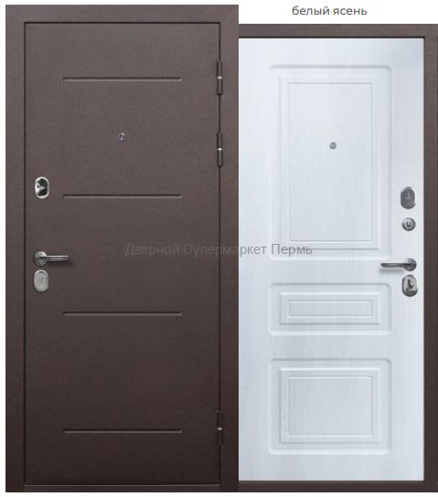 Внешнее покрытие: атмосферостойкое порошково-полимерное «медный антик» Внутреннее покрытие: фрезерованная МДФ-панель 10 мм, цвет – «белый ясень», «венге» Толщина дверного полотна: 90 мм Глубина дверного короба: 117 мм Наполнитель: пенополистирол Уплотнитель: 3 контура уплотнителя из вспененной резины Ручка: раздельная; цвет - хром Глазок: широкого обзора; цвет – хром Петли: 3 шт., наружные, открывание 180° Основной замок: цилиндровый MANGYST*, IV (наивысший) класс взломостойкости; диаметр ригелей: 16 мм Дополнительный замок: сувальдный MANGYST*, IV (наивысший) класс взломостойкости, дополнительная защита от высверливания: две пластины из высоколегированной стали с обеих сторон замка; диаметр ригелей: 16 мм Накладки: овальные с защитой от сквозняка; цвет - хром Независимая ночная задвижка Регулировка прижима притвора: металлический эксцентрик для защёлки на основном замке Противосъём: штыри, 2 шт. Размеры: 860х2050 мм, 960х2050 мм