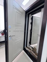 - Дверная коробка усиленная 130мм из цельногнутого профиля, три контура уплотненителя, одна дополнительная петля. Наличник П-обр. шириной 75мм; Толщина металла дверного полотна и коробки с полимерно-порошковым покрытием 1,5 мм; Вставка полиамидного термо-профиля