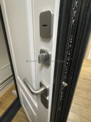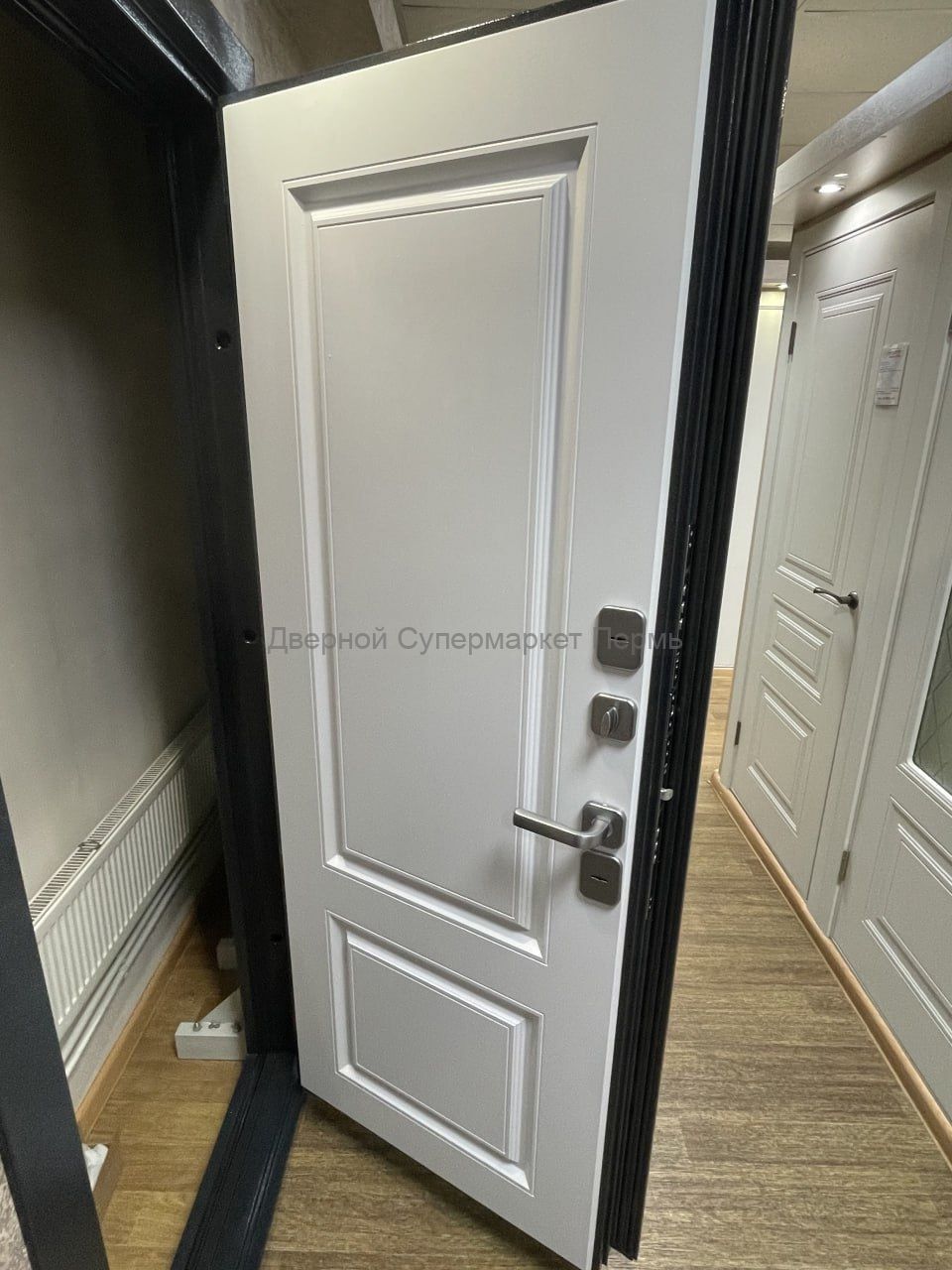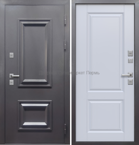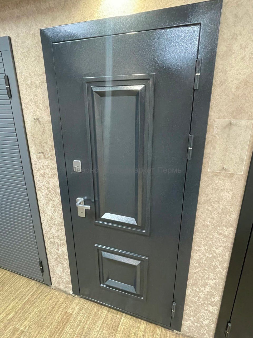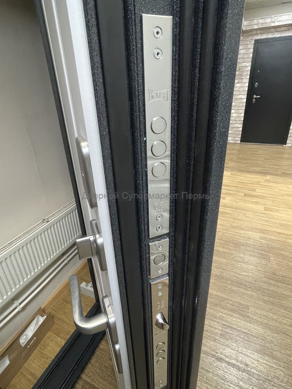 Покрытие: атмосферост. Букле Антрацит Внутр.покрытие: фрезер. МДФ-панель 10мм, цвет Астана Эш Уайт. Толщина полотна:110мм, коробки:141мм,  Уплотн. 3 контура. Петли 3шт. Осн. замок: сувальдный КАЛЕ, Доп замок: сувальдный КАЛЕ, НЗ. Эксцентрик на осн. замке металлический, пластиковый для ригелей.Терморазрыв полиамидный 24 мм. Наполнитель - ППС