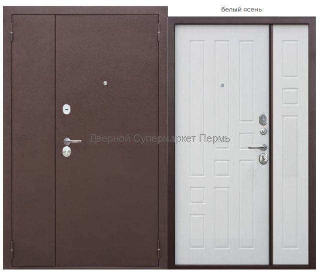 Внешнее покрытие: атмосферостойкое порошково-полимерное «медный антик» Внутреннее покрытие: фрезерованная МДФ-панель 10 мм, цвет – «белый ясень» Толщина дверного полотна: 68 мм Глубина дверного короба: 105 мм Наполнитель: пенополистирол Уплотнитель: 2 контура уплотнителя из вспененной резины Ручка: раздельная; цвет – хром Глазок: широкого обзора, цвет - хром Петли: 4 шт., наружные, открывание 180° Основной замок: цилиндровый RIGGER/MONARCH, IV (наивысший) класс взломостойкости; диаметр ригелей: 16 мм Дополнительный замок: сувальдный RIGGER/MONARCH, IV (наивысший) класс взломостойкости, дополнительная защита от высверливания: две пластины из высоколегированной стали с обеих сторон замка; диаметр ригелей: 16 мм Накладки: овальные с защитой от сквозняка; цвет – хром Независимая ночная задвижка Регулировка прижима притвора: металлический эксцентрик для защёлки на основном замке Противосъём: штыри, 4 шт. Размеры: 1200х2050мм, 1300х2050мм