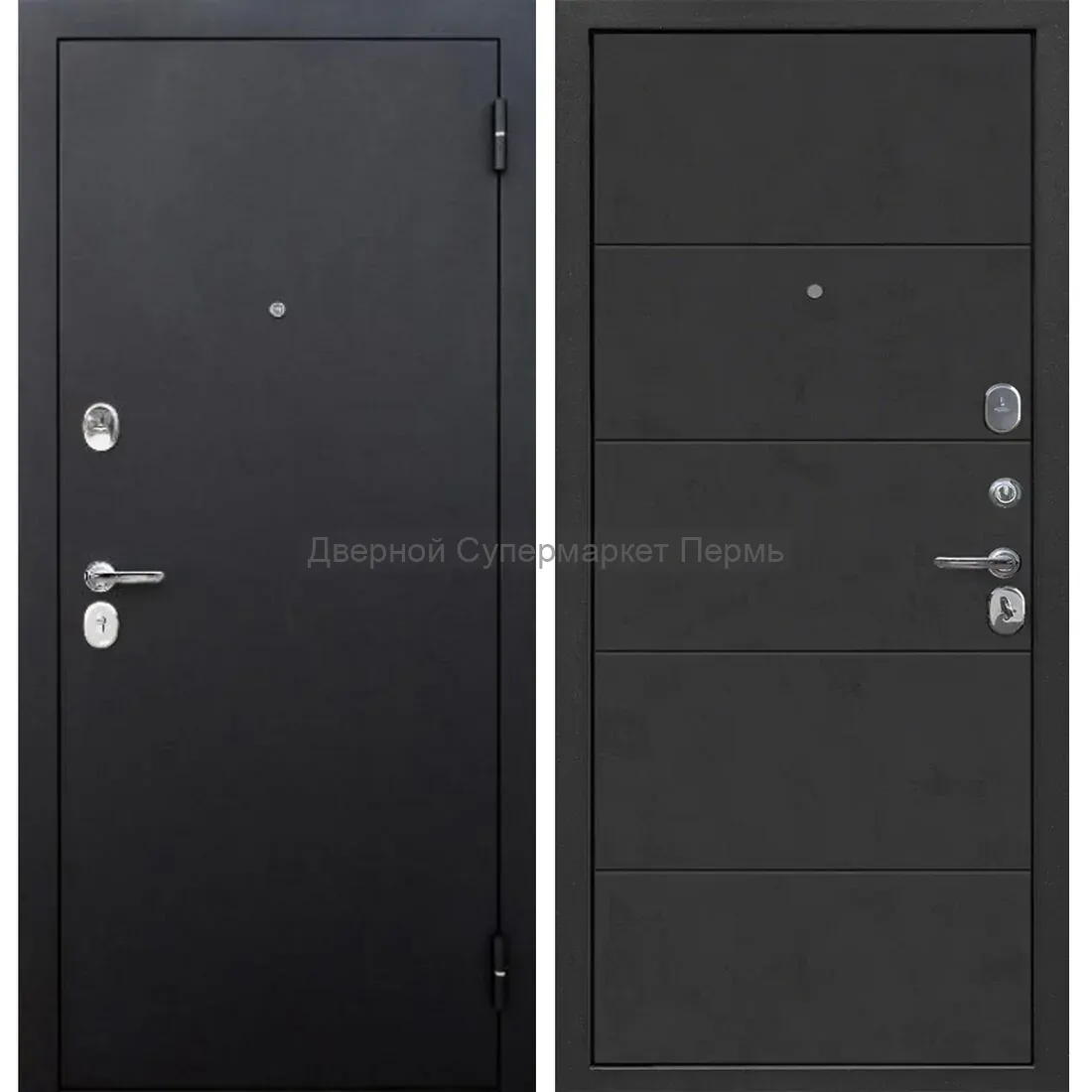 Внешнее покрытие: атмосферостойкое порошково-полимерное «букле черный» Внутреннее покрытие: фрезерованная МДФ-панель 8 мм, цвет - «бетон снежный», «бетон графит» Толщина дверного полотна: 75 мм Глубина дверного короба: 105 мм Наполнитель: пенополистирол Уплотнитель: 2 контура уплотнителя из вспененной резины Ручка: раздельная; цвет – хром Глазок: широкого обзора; цвет – хром Петли: 2 шт., наружные, открывание 180° Основной замок: цилиндровый MANGYST*, IV (наивысший) класс взломостойкости; диаметр ригелей: 16 мм Дополнительный замок: сувальдный MANGYST*, IV (наивысший) класс взломостойкости, дополнительная защита от высверливания: две пластины из высоколегированной стали с обеих сторон замка; диаметр ригелей: 16 мм Накладки: овальные с защитой от сквозняка; цвет – хром Независимая ночная задвижка Регулировка прижима притвора: металлический эксцентрик для защёлки на основном замке Противосъём: штыри, 2 шт. Размеры: 860х2050 мм, 960х2050 мм
