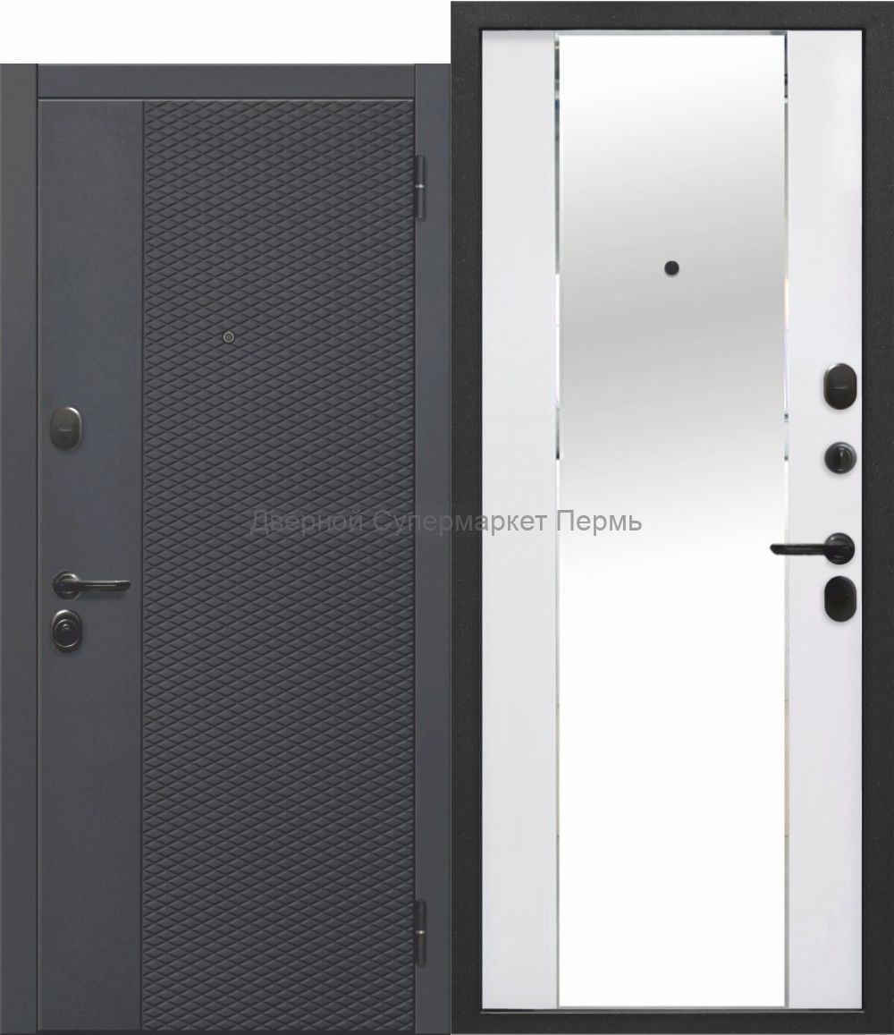 Покрытие: фрезерованная МДФ-панель 10мм,внутр.покрытие:фрезерованная МДФ-панель 10мм, накладное зеркало с защитной пленкой. Толщина дверного полотна: 90мм. Уплотнение: 2 контура уплотнителя из вспененной резины.Петли: 2шт.Основной замок: цилиндровый MONARCH,IV(наивысший). Диаметр ригелей:16 мм.Доп.замок:сувальный MONARCH,IV (наивысший).Ночная задвижка.