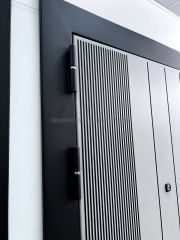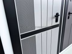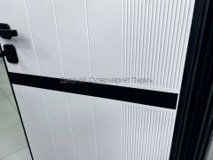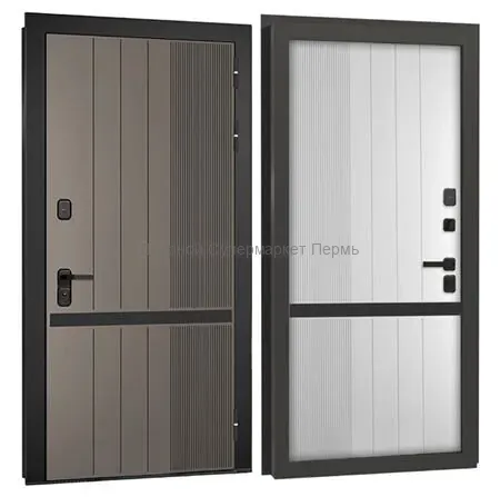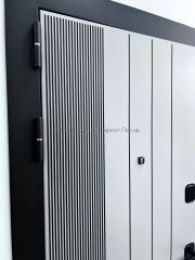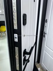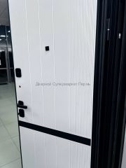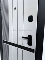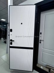 Внешняя отделка:полимерно-порошковое, черный муар. Отделка: МДФ 10мм, велютто гриджио 511-2 АЛФ + патина черная по фрезеровке и в углублениях под фурнитуру, ФЛМ-609 (черный муар). БЕЗ МДФ наличников (ППБМ) Внутренняя отделка: МДФ 10мм, софт белый снег ZB 800 Толщина полотна: 90 мм, короб открытый Толщина металла: 1,4 мм. Заполнение полотна: Базальтовая плита. Осн. замок: Замок врезной цилиндровый Г3211. Доп. замок: Замок врезной сувальдный Г3001, НЗ, Петли: 3 шт., эксцентрик, 3 контура D-профиль 10х12