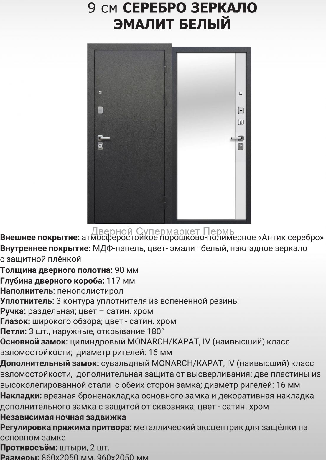 Дверь входная 9 см Феррони Серебро Зеркало Эмалит белый NEW предназначена для установки в квартиру, если нужно максимально сберечь тепло, при этом нет мешающего шума, нужна защита от запахов, а так же нужна защита от взлома.
