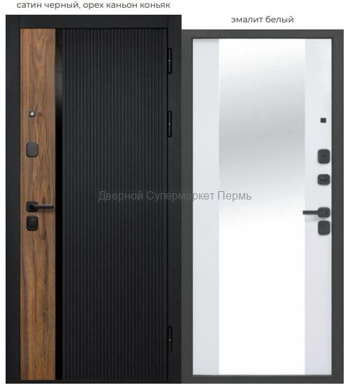 Внешнее покрытие: фрезерованная МДФ-панель 10 мм, цвет – «сатин черный», «орех каньон коньяк», вставка - черное стекло Внутреннее покрытие: фрезерованная МДФ-панель 10 мм, цвет – «эмалит белый», накладное зеркало с защитной плёнкой Толщина дверного полотна: 104 мм Глубина дверного короба: 115 мм Наполнитель: пенополистирол Уплотнитель: 3 контура уплотнителя из вспененной резины Ручка: раздельная; цвет – черный Глазок: широкого обзора; цвет – черный Петли: 3 шт., наружные, открывание 180° Основной замок: цилиндровый MANGYST*, IV (наивысший) класс взломостойкости; диаметр ригелей: 16 мм Дополнительный замок: сувальдный MANGYST*, IV (наивысший) класс взломостойкости, дополнительная защита от высверливания: две пластины из высоколегированной стали с обеих сторон замка; диаметр ригелей: 16 мм Накладки: накладная броненакладка основного замка, декоративная накладка дополнительного замка с защитой от сквозняка; цвет – черный Независимая ночная задвижка Регулировка прижима притвора: металлический эксцентрик для защёлки на основном замке Противосъём: штыри, 2 шт. Размеры: 860х2050 мм, 960х2050 мм