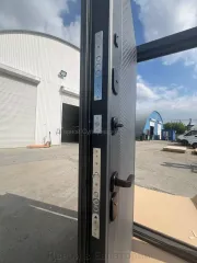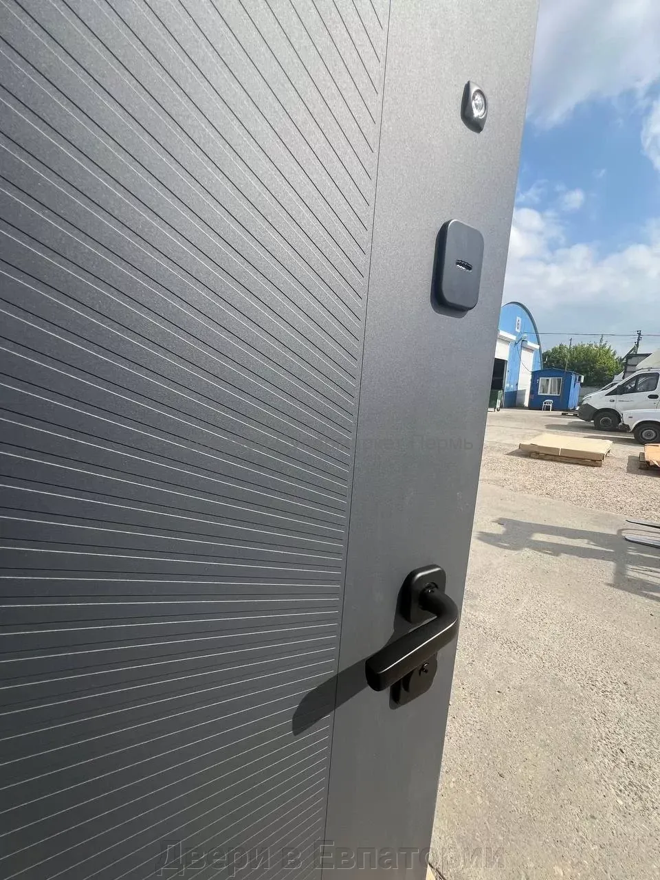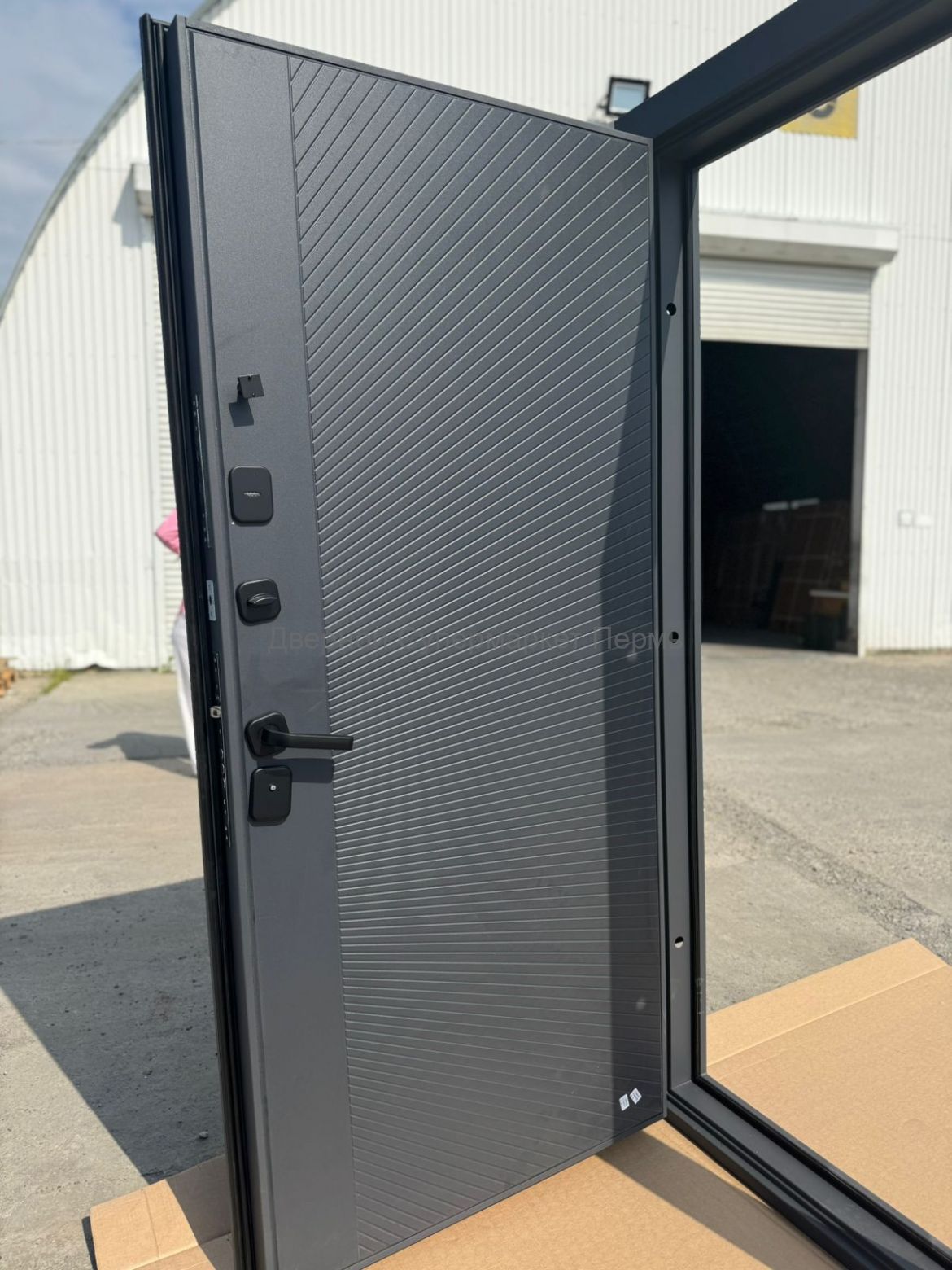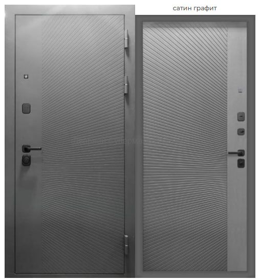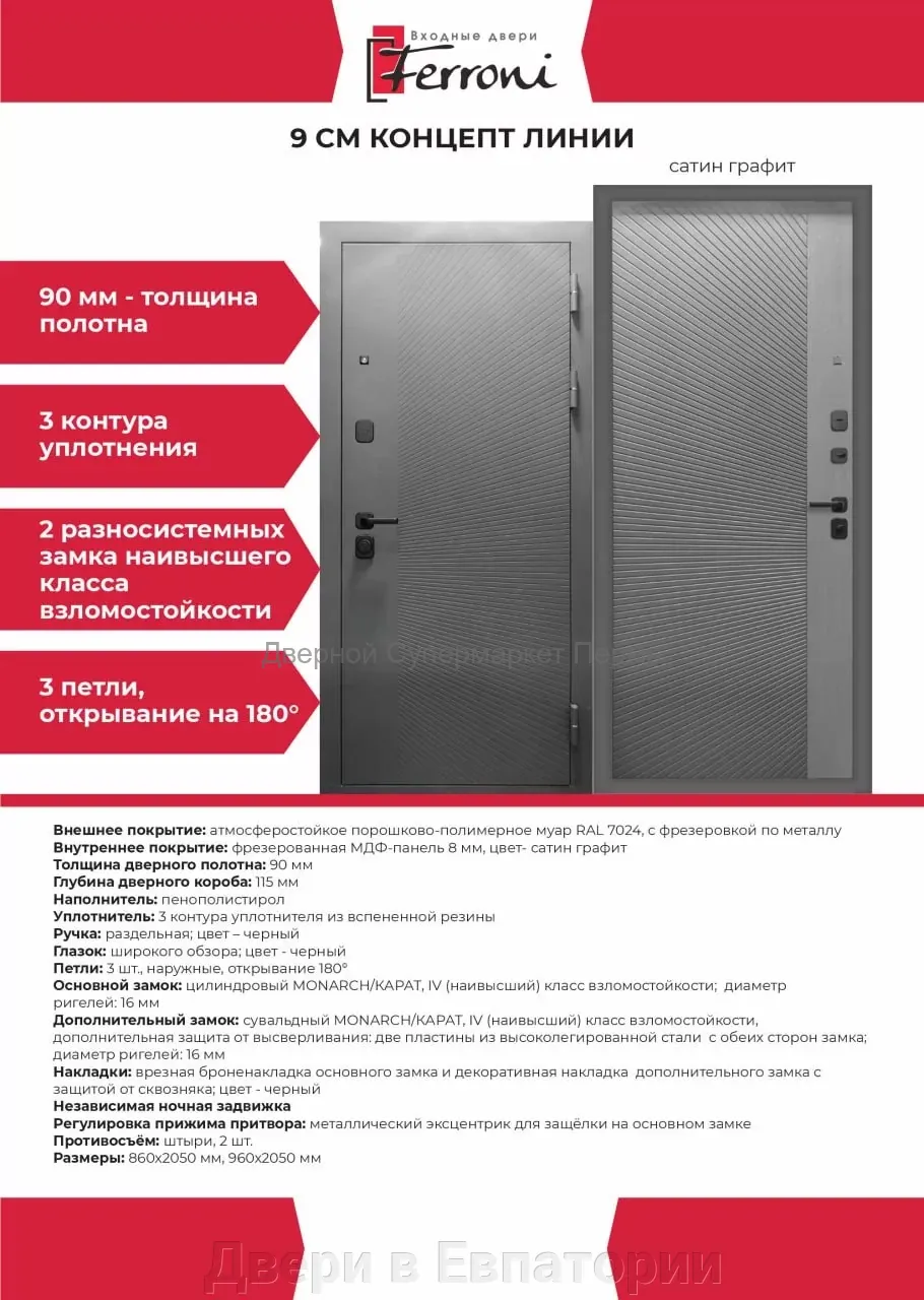 Внешнее покрытие: атмосферостойкое порошково-полимерное муар RAL 7024, с фрезеровкой по металлу Внутреннее покрытие: фрезерованная МДФ-панель 10 мм, цвет- сатин графит Толщина дверного полотна: 90 мм Глубина дверного короба: 115 мм Наполнитель: пенополистирол Уплотнитель: 3 контура уплотнителя из вспененной резины Ручка: раздельная; цвет – черный Глазок: широкого обзора; цвет - черный Петли: 3 шт., наружные, открывание 180° Основной замок: цилиндровый MANGYST*, IV (наивысший) класс взломостойкости; диаметр ригелей: 16 мм Дополнительный замок: сувальдный MANGYST*, IV (наивысший) класс взломостойкости, дополнительная защита от высверливания: две пластины из высоколегированной стали с обеих сторон замка; диаметр ригелей: 16 мм Накладки: врезная броненакладка основного замка и декоративная накладка дополнительного замка с защитой от сквозняка; цвет - черный Независимая ночная задвижка Регулировка прижима притвора: металлический эксцентрик для защёлки на основном замке Противосъём: штыри, 2 шт. Размеры: 860х2050 мм, 960х2050 мм