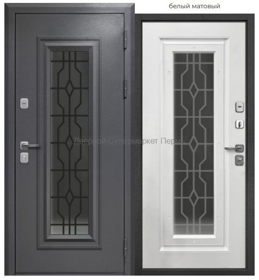 Внешнее покрытие: атмосферостойкое порошково-полимерное «Букле графит» Внутреннее покрытие: МДФ-панель 8 мм, цвет – «белый матовый» Толщина дверного полотна: 90 мм Глубина дверного короба: 117 мм Стеклопакет: 2 камеры, 83 мм, тонированный, с фигурной вставкой Наполнитель: пенополистирол Уплотнитель: 3 контура уплотнителя из вспененной резины (2 на полотне, 1 на коробе) Ручка: раздельная; цвет - сатин хром Петли: 3 шт., наружные, открывание 180° Основной замок: цилиндровый MANGYST*, IV (наивысший) класс взломостойкости; диаметр ригелей: 16 мм Дополнительный замок: сувальдный MANGYST*, IV (наивысший) класс взломостойкости, дополнительная защита от высверливания: две пластины из высоколегированной стали с обеих сторон замка; диаметр ригелей: 16 мм Накладки: квадратные с защитой от сквозняка; цвет - сатин хром Независимая ночная задвижка Регулировка прижима притвора: металлический эксцентрик для защёлки на основном замке Противосъём: штыри, 2 шт. Размеры: 860х2050 мм, 960х2050 мм