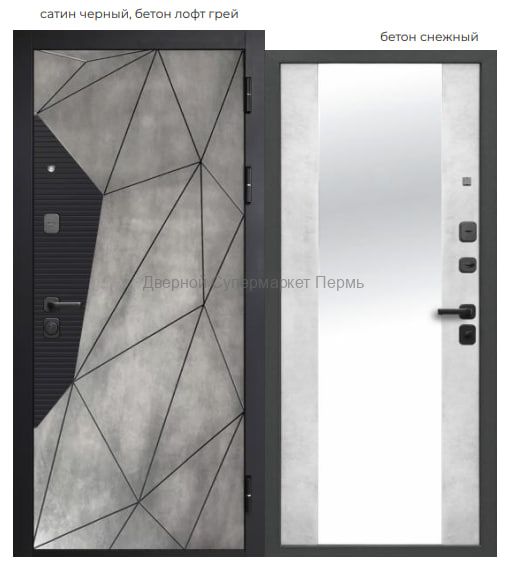 Внешнее покрытие: фрезерованная МДФ-панель 10 мм, цвет – «сатин черный», «бетон лофт грей» Внутреннее покрытие: фрезерованная МДФ-панель 10 мм, цвет – «бетон снежный», накладное зеркало с защитной плёнкой Толщина дверного полотна: 104 мм Глубина дверного короба: 115 мм Наполнитель: пенополистирол Уплотнитель: 3 контура уплотнителя из вспененной резины Ручка: раздельная; цвет – черный Глазок: широкого обзора; цвет – черный Петли: 3 шт., наружные, открывание 180° Основной замок: цилиндровый MANGYST*, IV (наивысший) класс взломостойкости; диаметр ригелей: 16 мм Дополнительный замок: сувальдный MANGYST*, IV (наивысший) класс взломостойкости, дополнительная защита от высверливания: две пластины из высоколегированной стали с обеих сторон замка; диаметр ригелей: 16 мм Накладки: накладная броненакладка основного замка, декоративная накладка дополнительного замка с защитой от сквозняка; цвет – черный Независимая ночная задвижка Регулировка прижима притвора: металлический эксцентрик для защёлки на основном замке Противосъём: штыри, 2 шт. Размеры: 860х2050 мм, 960х2050 мм