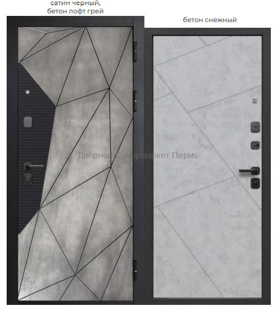 Внешнее покрытие: фрезерованная МДФ-панель 10 мм, цвет – «сатин черный», «бетон лофт грей» Внутреннее покрытие: фрезерованная МДФ-панель 10 мм, цвет – «бетон снежный» Толщина дверного полотна: 104 мм Глубина дверного короба: 115 мм Наполнитель: пенополистирол Уплотнитель: 3 контура уплотнителя из вспененной резины Ручка: раздельная; цвет – черный Глазок: широкого обзора; цвет – черный Петли: 3 шт., наружные, открывание 180° Основной замок: цилиндровый MANGYST*, IV (наивысший) класс взломостойкости; диаметр ригелей: 16 мм Дополнительный замок: сувальдный MANGYST*, IV (наивысший) класс взломостойкости, дополнительная защита от высверливания: две пластины из высоколегированной стали с обеих сторон замка; диаметр ригелей: 16 мм Накладки: квадратные, накладная броненакладка основного замка, декоративная накладка дополнительного замка с защитой от сквозняка; цвет – черный Независимая ночная задвижка Регулировка прижима притвора: металлический эксцентрик для защёлки на основном замке Противосъём: штыри, 2 шт. Размеры: 860х2050 мм, 960х2050 мм