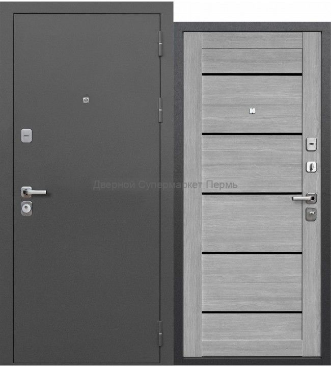 Внешнее покрытие: атмосферостойкое порошково-полимерное «антик серебро» Внутреннее покрытие: царговая МДФ-панель 16 мм, цвет - «дымчатый дуб», вставки из стекла Лакобель Толщина дверного полотна: 90 мм Глубина дверного короба: 117 мм Наполнитель: пенополистирол Уплотнитель: 3 контура уплотнителя из вспененной резины Ручка: раздельная; цвет - сатин. хром Глазок: широкого обзора; цвет - сатин. хром Петли: 3 шт., наружные, открывание 180° Основной замок: цилиндровый MANGYST*, IV (наивысший) класс взломостойкости; диаметр ригелей: 16 мм Дополнительный замок: сувальдный MANGYST*, IV (наивысший) класс взломостойкости, дополнительная защита от высверливания: две пластины из высоколегированной стали с обеих сторон замка; диаметр ригелей: 16 мм Накладки: квадратные, врезная броненакладка основного замка и декоративная накладка дополнительного замка с защитой от сквозняка; цвет - сатин хром Независимая ночная задвижка Регулировка прижима притвора: металлический эксцентрик для защёлки на основном замке Противосъём: штыри, 2 шт. Размеры: 860х2050 мм, 960х2050 мм