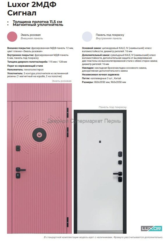 Luxor 2МДФ Сигнал • Толщина полотна 11,5 см • Магнитный уплотнитель Эмаль розовая Внешняя панель Панель под покраску Внутренняя панель Внешнее покрытие: фрезерованная МДФ-панель 12 мм, цвет пленки «Эмаль розовая» Внутреннее покрытие: фрезерованная МДФ-панель 6 мм, панель под покраску Толщина дверного полотна/короба: 115 мм / 128 мм Порог из нержавеющей стали Наполнитель: пенополистирол Уплотнитель: 3 контура уплотнителя из вспененной резины (1 магнитный на коробе, 2 на полотне) Основной замок: цилиндровый KALE, IV (наивысший) класс взломостойкости; диаметр ригелей: 16 мм Дополнительный замок: сувальдный KALE, IV (наивысший) класс взломостойкости, дополнительная защита от высверливания: две пластины из высоколегированной стали с обеих сторон замка; диаметр ригелей: 16 мм Накладки: накладная броненакладка основного замка, декоративная дополнительного замка Независимая ночная задвижка Петли: каплевидные 3 шт., Китай Размеры: 860х2050 мм, 960х2050 мм НОВИН КА Панель под покраску Эмаль розовая