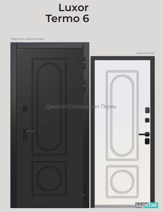 Внешнее покрытие: атмосферостойкое порошково-полимерное «Муар черный», фрезерованная МДФ-панель 12 мм, эмаль черная матовая Внутреннее покрытие: фрезерованная МДФ-панель 10 мм, цвет пленки «Эмалит белый» Толщина дверного полотна/короба: 110 мм / 141 мм Терморазрыв 24 мм: двухкамерный спейсер из ПВХ на коробе и полотне двери Порог из нержавеющей стали Наполнитель: PIR-плита Уплотнитель: 3 контура уплотнителя из вспененной резины (2 на полотне, 1 на коробе) Замки: сувальдные KALE, IV (наивысший) класс взломостойкости, дополнительная защита от высверливания: две пластины из высоколегированной стали с обеих сторон замка; диаметр ригелей: 16 мм. Независимая ночная задвижка Петли: каплевидные 3 шт., Италия Размеры: 860х2050 мм, 960х2050 мм