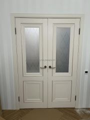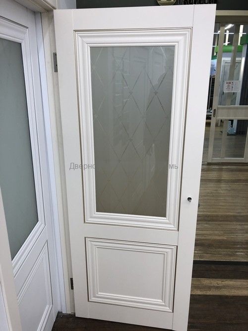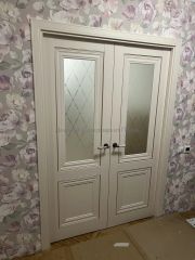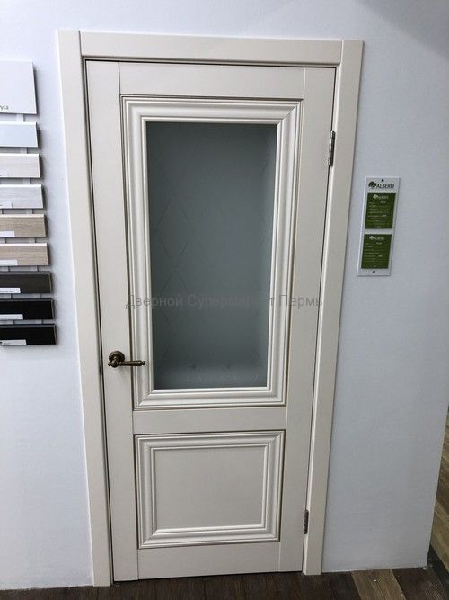 Элегантность и в то же время простоту содержит модель «Прадо» в цвете ваниль винил от фабрики Альберо. Вертикальные багетные вставки из МДФ в глухой двери и из матового стекла с рисунком в остекленной делают вашу квартиру более светлой и просторной.